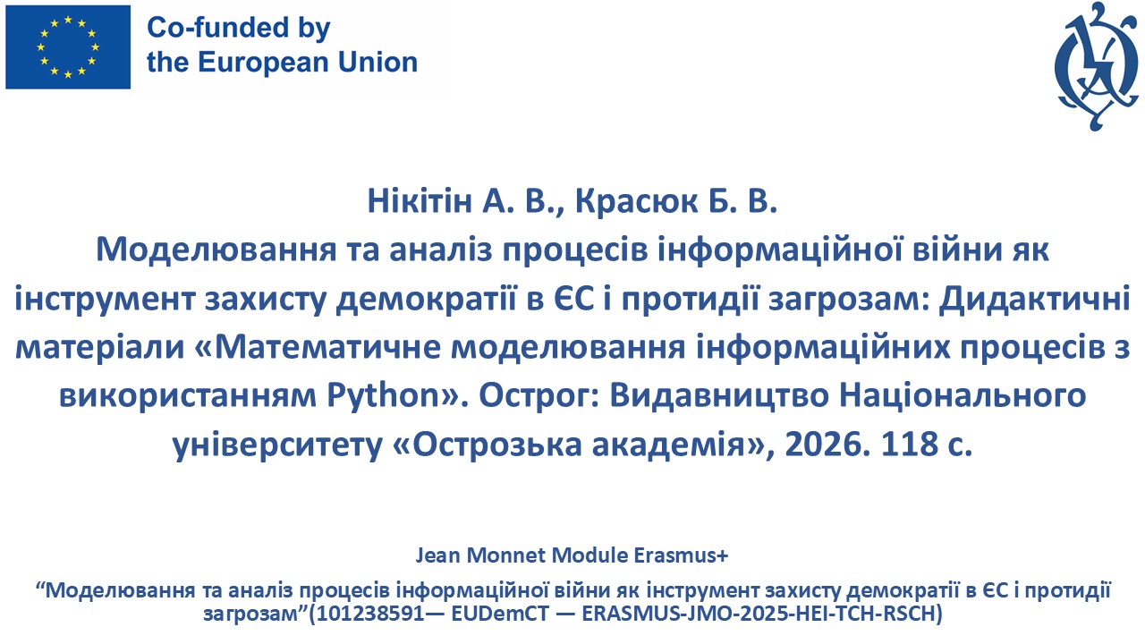 Нікітін А. В., Красюк Б. В. Моделювання та аналіз процесів інформаційної війни як інструмент захисту демократії в ЄС і протидії загрозам: Дидактичні матеріали «Математичне моделювання інформаційних процесів з використанням Python». Острог: Видавництво Національного університету «Острозька академія», 2026. 118 с.